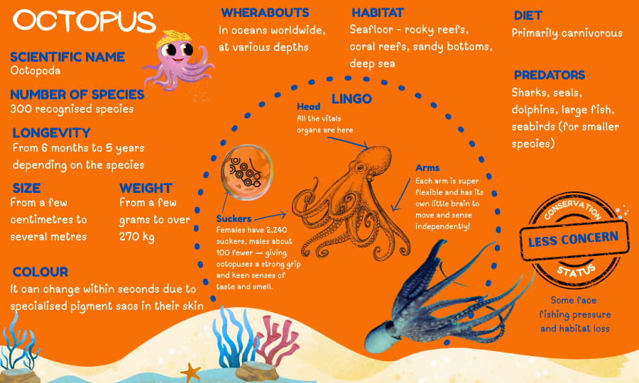 Octopuses are super cool sea creatures! They are smart, sneaky, and sometimes even a little silly. Here are some fun facts about these eight-armed wonders: