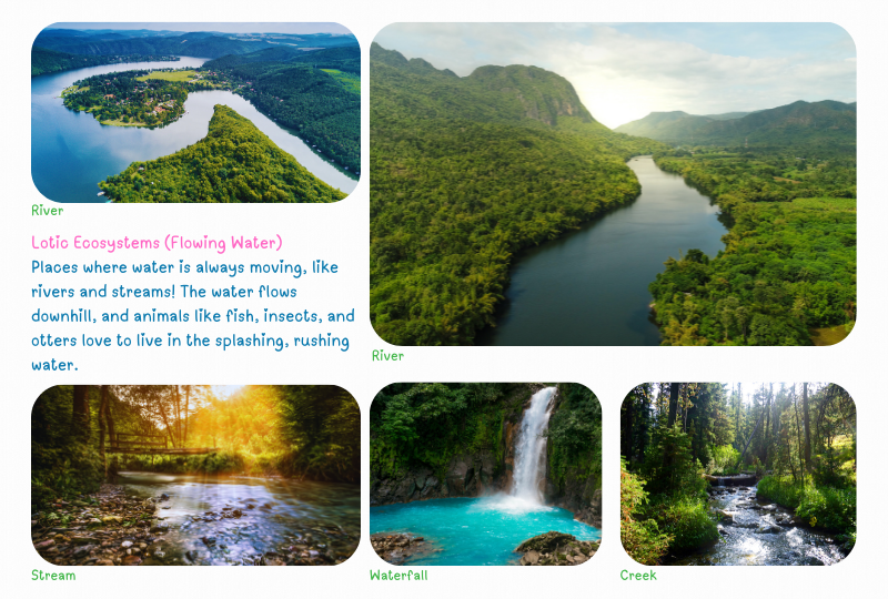 - Rivers: Big moving water that flows from high places down to the sea or a lake.